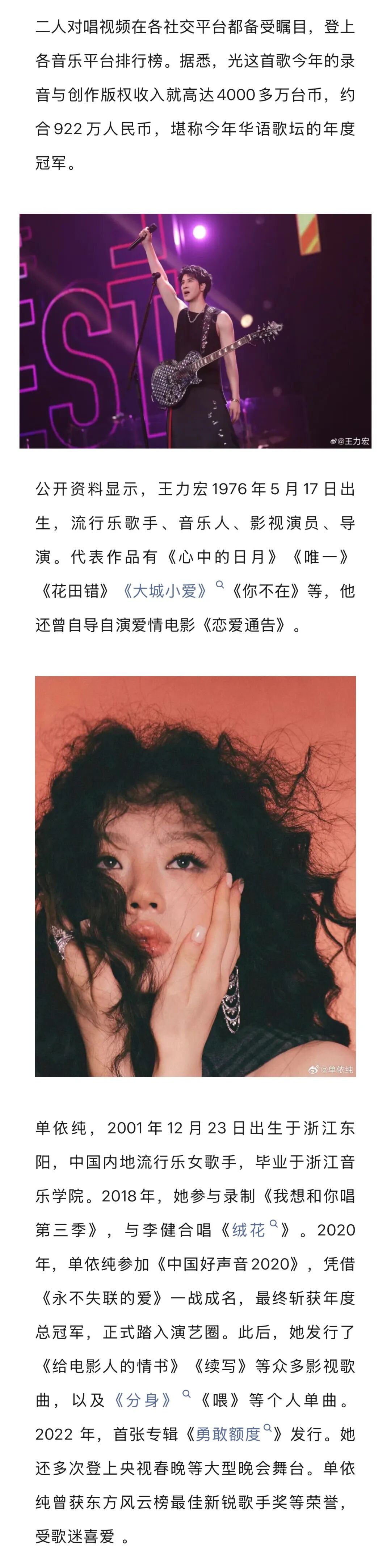 11月4日,据潇湘晨报综合中天电视亚洲台。王力宏和单依纯对唱版《爱错》官方音源于2025年11月1日零点全平台上线。2025年10月3日,单依纯作为特邀嘉宾亮相王力宏深圳演唱会,两人首次公开合唱《爱错》。