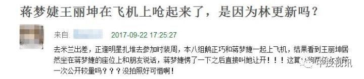 两人最新被联系起来是因为巴黎时装周,蒋梦婕和林更新最新的绯闻女友王丽坤同被品牌邀请看秀。有网友爆料称在飞机上遇到了蒋梦婕和王丽坤两人,并称两人在飞机上起了冲突。