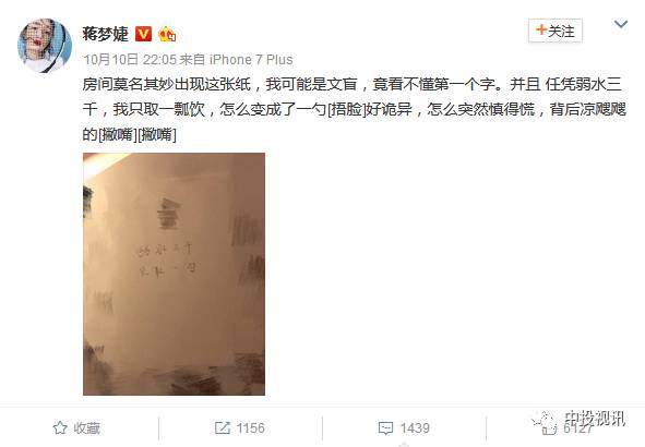 说是在酒店房间里莫名出现了一张写有“溺水三千,只取一勺”的纸,可以说是非常内涵了。