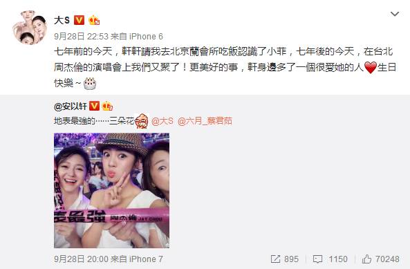 就在前几天安以轩晒出和大S以及女星蔡君茹的合影,称她们是“地表最强的三朵花”