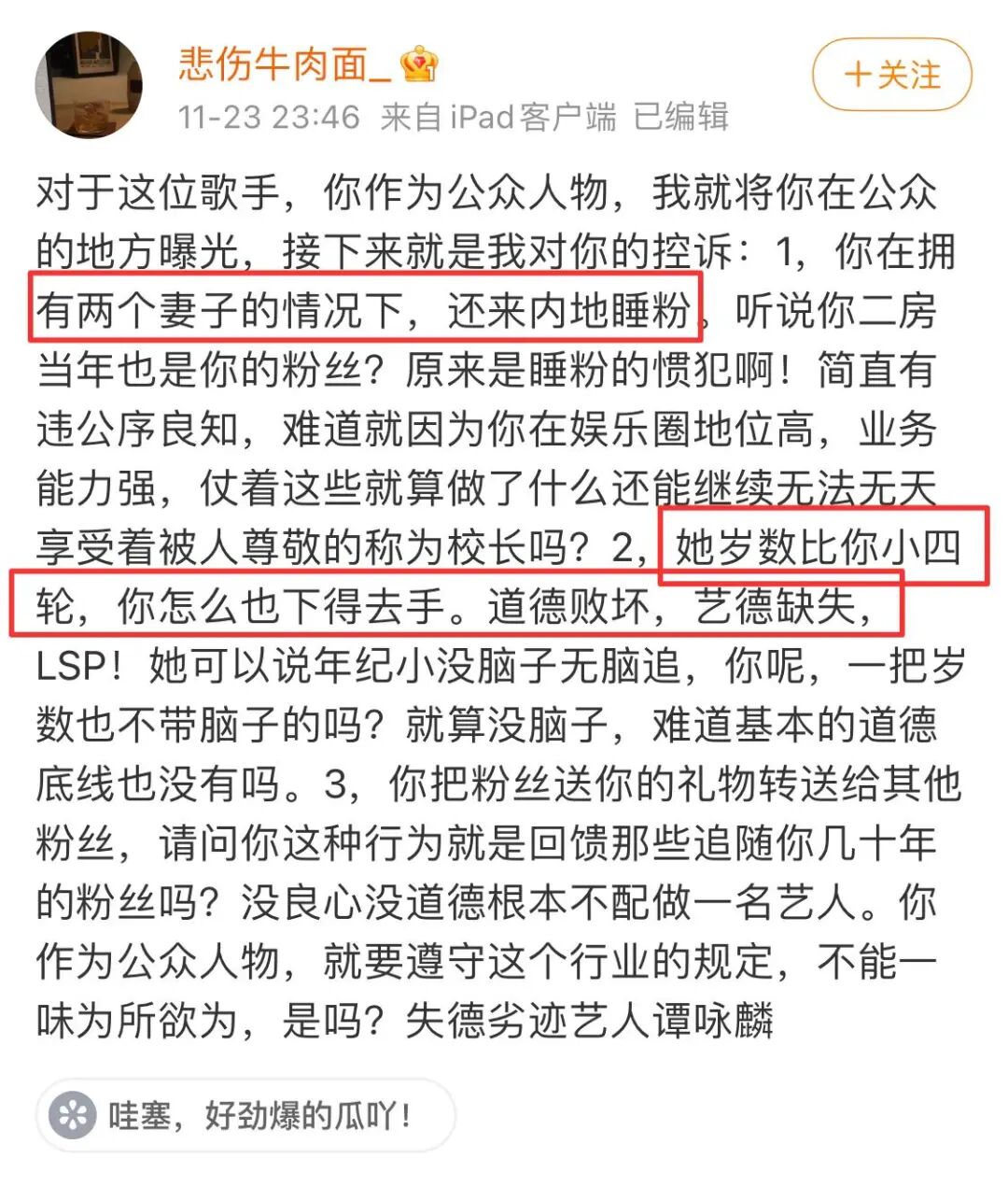 71岁谭咏麟睡粉?他曾渣到老婆出家 育儿网 港台男星 2021-11-25 12:18:35 809 创作不易,用心坚持,欢迎请BaGua喝几杯爱心咖啡!打赏并支持本文 打赏并删除本文 豆瓣娱乐组刚一解封就贡献大瓜,来丰富这平平无奇的工作日。微博网友“悲伤牛肉面_”激情开麦,自称是谭咏麟某女粉的男朋友,控诉谭咏麟“不守男德”勾搭他女朋友还与其发生了不可描述的关系。他的女友今年20出头,而谭咏麟今年71了,这都古稀之年了还有人落入他的“爱情陷阱”?小编着实是有被震惊到。“悲伤牛肉面_”连发6条微博控诉谭咏麟,字里行间都是愤怒。但所谓的实锤,只有疑似谭咏麟的背影图。网友:[有锤就放锤,不想看小作文了][???这是妥妥爷孙恋哦][谭校长不是这样的人吧][之前的二老婆不也是粉丝吗?“老传统了”]网友们都在云里雾里地吃瓜,有在等实锤的,有在等谭咏麟声明的。结果好家伙,应采儿也在线吃瓜点赞,是手滑?还是耿直?给这瓜蒙上了一层神秘色彩。网友们吃瓜时还不忘心疼芒果台,毕竟前有披荆斩棘的霍某、李某迪。这下谭咏麟还在录制芒果的综艺《时光音乐会》,不得不说芒果台今年的运势和汪峰老师有得一拼啊。终究还是芒果台的后期承担了所有。昨天下午6点,谭咏麟方发布了声明,指控男网友所述皆是不实消息。随后男网友又上传了背影图。谭咏麟方会不会继续声明、维权,咱们默默蹲个后续。话说回来,这瓜热度可真不小,昨天下午直接冲上了热搜第一。毕竟那可是谭咏麟。出道53年各个奖项拿到手软,放到现在来讲就是:想要爆成“顶流”的所有因素,都仿佛是以谭咏麟为标杆定制的。当年香港电台的“中文歌曲龙虎榜”冠军歌,每周一首,谭咏麟在80年代一共是28首。1984年,年仅34的谭咏麟在香港红馆举行6场演唱会,打破了香港红馆歌手初次开演唱会的场次记录。从1984至1987年,香港十大劲歌歌曲奖,谭咏麟连续四年获得最受欢迎男歌手奖,拿奖拿到手软,可以说是完全统领了八十年代的乐坛。电影上,谭咏麟凭借着《假如我是真的》获得台湾金马奖影帝。1987年,他跟成龙合作的《龙兄虎弟》拿下票房冠军,是同时期电影圈内仅次于周润发,成龙的香港扛票房的男演员。同时还有直到现在都会被人提及的那段喧嚣了整个80年代的“谭张争霸”。谭咏麟和张国荣俩人基本上垄断了香港乐坛大大小小的音乐奖项,但凡两人同时出现的场面,必定是掌声与嘘声齐飞。在1985年的十大金曲颁奖典礼上,谭张争霸的线下掐架可谓是现在饭圈撕逼的源头。张国荣当时在颁奖礼上说:“有些人想得到某些东西要花较长的时间,不过至少我现在得到的东西是我努力得到的。”被在场的谭咏麟粉丝认为是在影射。颁奖典礼刚结束,双方粉丝就在场馆外大打出手,谭咏麟和张国荣一度被困在场馆6小时无法脱身。其实谭咏麟和张国荣的关系并非水火不容,在当年网络不发达粉丝都是线下打假和媒体添油加醋的报道下,俩位当事人身心俱疲。1988年十大金曲颁奖典礼上,谭咏麟宣布自己不再受领竞争性奖项。而在谭咏麟公布这个消息一年后,张国荣也在演唱会上宣布自此退出歌坛。自此,谭张争霸才算落幕,香港也开始迎来了四大天王...谭咏麟和张国荣都是全能型艺人,演艺成就毋庸置疑。他俩最大的不同大概就是在对待感情上。张国荣用情至深,而谭咏麟则是渣得明明白白。只不过在那个网络并不发达的年代,这位顶流还称不上“塌房”。一个对自己自律、对朋友友善、对儿子慈爱的老艺术家,这辈子最对不起的大概就是他的原配——杨洁薇。认识杨洁薇时,谭咏麟虽然刚出道没多久,但已经凭借过硬的唱功,成为了乐队的主唱。很偶然的,在酒吧结识了当年时尚又漂亮的杨洁薇。那时候的杨洁薇有着一个令人羡慕的“潮流”工作——在一家化妆品公司做美容顾问。她对化妆品十分精通,做过很多惊艳观众的舞台造型。这样的一个女孩,很难有男生不对她心动吧!杨洁薇对谭咏麟也是十分仰慕,两人很快坠入爱河。本是“佳偶天成”的一段良缘,却没想到是杨洁薇悲剧的开始。相恋后的杨洁薇为了只给谭咏麟一人服务,辞去了自己的工作,全心全意为男友打造活动造型。当然,还有一层原因是杨洁薇觉得男友作为“偶像”,想要跟他在一起,就必须放弃自己的事业。于是,杨洁薇成了谭校长“背后的女人”。他每一次的演出、活动,都有杨洁薇的陪伴。一个为了自己可以“放弃一切”的女人,按理说,谭咏麟应该倍加珍惜。确实谭咏麟感激她,可是迫于事业的影响,加之当时成龙公布婚讯后,有粉丝跳楼。即便两人已经结婚,也没敢对外公布婚讯。直到1993年杨洁薇父亲去世,讣文刊登“婿谭咏麟”,他们的夫妻关系才得以正式公开。这样一心付出的杨洁薇却没有换来谭咏麟全心全意的回报。在1991年一次歌迷会上,他认识了当时尚未大学毕业的年轻漂亮的女孩——朱咏婷。有人说她是谭咏麟的粉丝,也有人说不是。但自古美人爱才子,两人关系越来越近,开始偷偷约会。地下恋情到结婚十几年,杨洁薇都没要过一个正式的名分,甚至被谭咏麟“PUA”没有生孩子。谁能想到一个“私生子”的出现,打破了这看似“平静”的生活。1996年,朱咏婷怀孕了。已经46岁,本来不想要孩子的谭咏麟犹豫了。思来想去,他决定让朱咏婷把孩子生下来。孩子的到来,才让杨洁薇后知后觉的发现丈夫出轨了,自己的一片真心