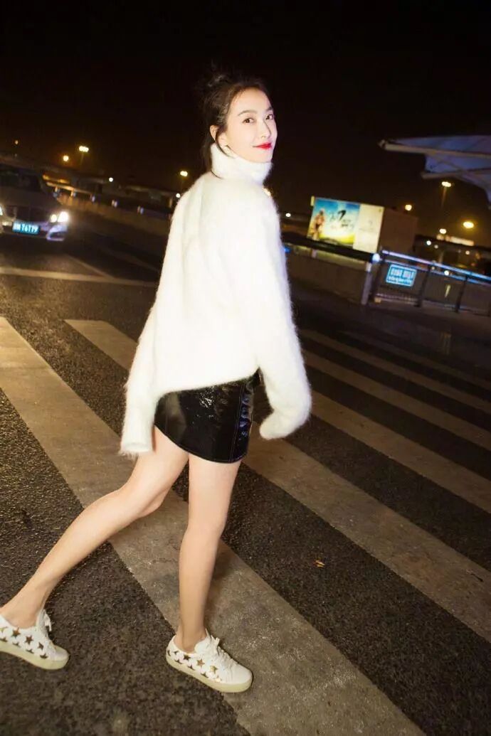 红唇秀发,侧首而笑。高领长袖毛衣,搭配黑色短裙,再与一双点缀这金色的厚底板鞋一起。简直活力无限!让人觉得她是小女孩的姿态,非常的优雅。同时,人们又能欣赏到她优美的身姿。
