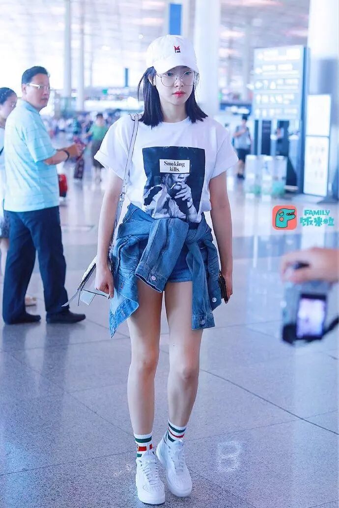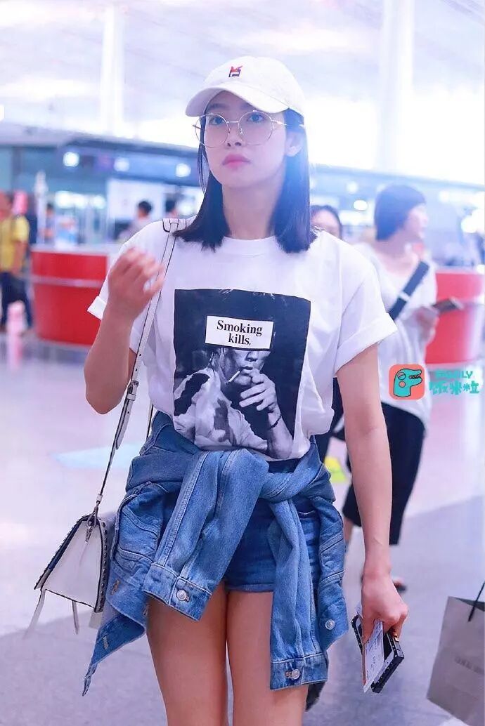 她身着牛仔短裤,搭配T恤短袖,牛仔外套系在腰间,挎一个肩包,一种随和的休闲时尚。白色棒球帽下,她戴着一副金大圆细框眼镜,让她表达年轻活力的同时,又多了一种女性特有的细腻。