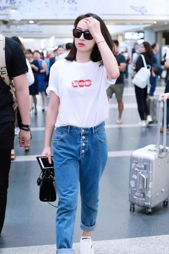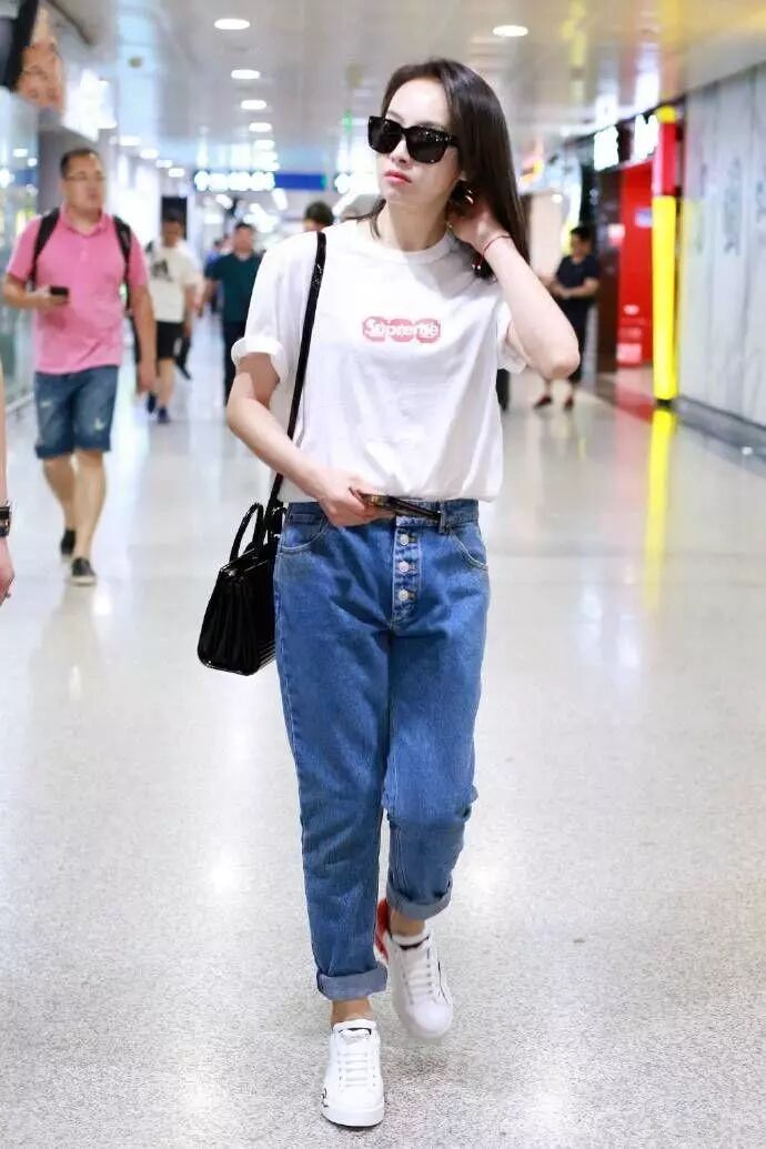 墨镜的她,非常的酷。有独特的个性魅力。白色T恤搭一件牛仔裤,黑色的肩包搭上,再穿一双白色运动板鞋。一种独特的年轻的非常具有活力的气息,在你眼前展现。