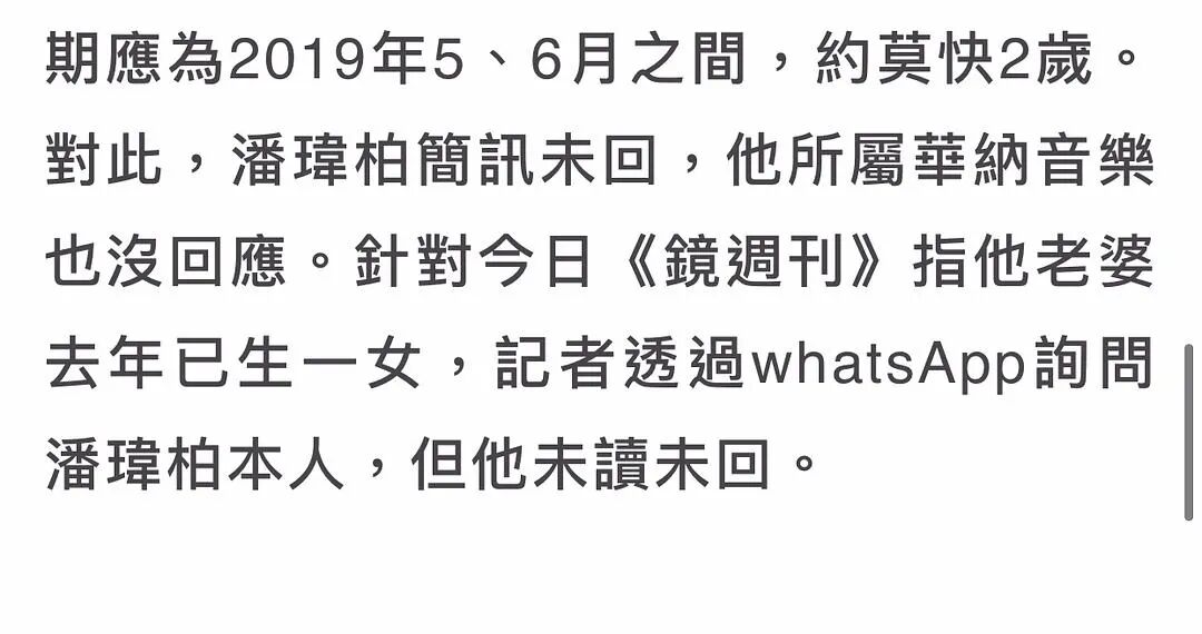 有媒体就潘玮柏已当爸爸一事联系潘玮柏的经纪公司,对方表示联系不上在内地的潘玮柏,还说在30日和潘玮柏的合约就到期,无法帮他回答这方面的事。