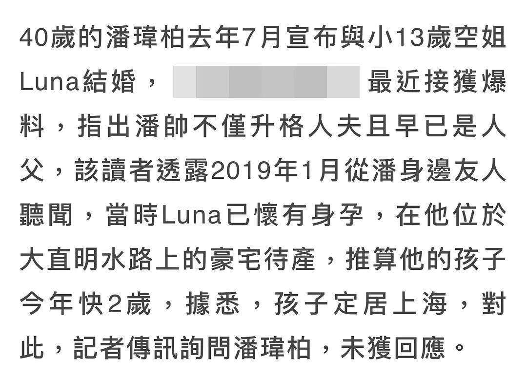 近日,有媒体报道,潘玮柏和老婆Luna的共同好友爆料两人在登记结婚时,Luna就已经怀了潘玮柏的小孩。今年夏天,他们的女儿即将要满一周岁。