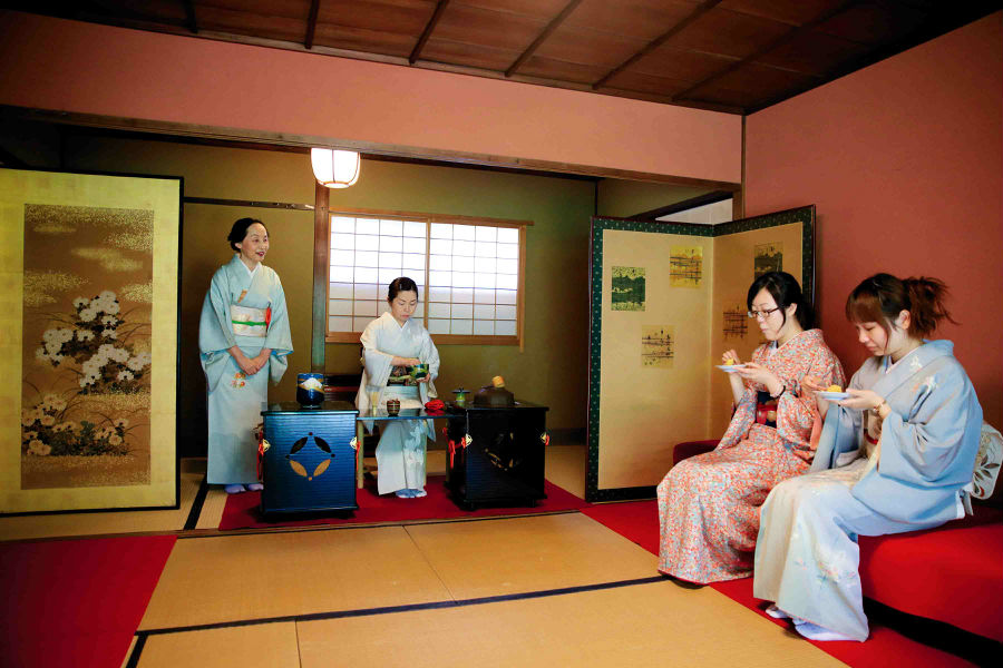在加贺友禅传统产业会馆换上和服,可散步至一旁的西田家庭园。在这座有着120年的老宅子的茶室中品茶赏园,呼吸着传统和风的清雅一刻。