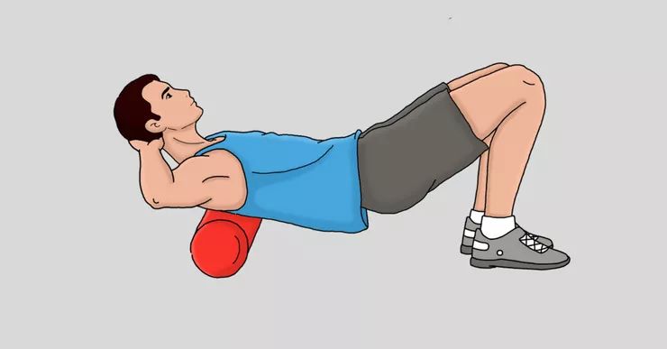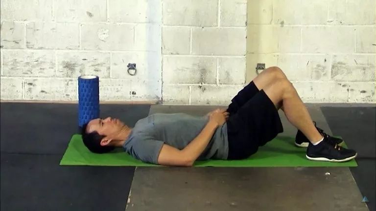仰卧,双手放在头后,在上背部下方放一个泡沫轴。从中后部开始慢慢上下滚动,然后向肩膀顶部移动。 在感觉紧绷的区域暂停15至20秒。在任何紧密区域重复滚动。