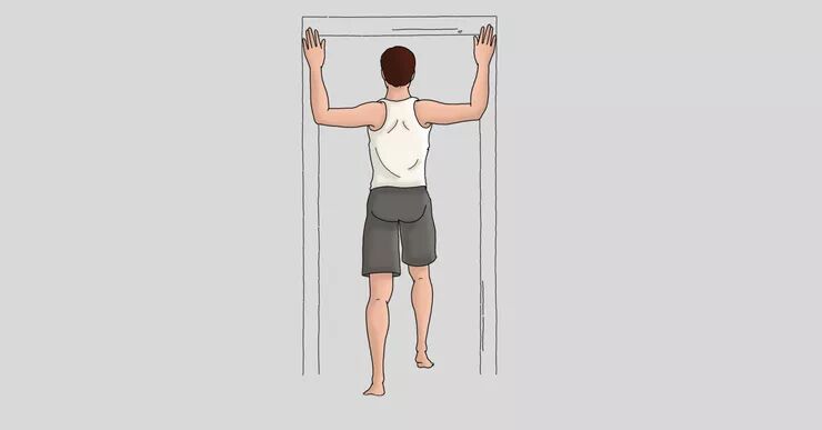 将双手呈90度放在门框上,然后慢慢地靠近门的方向,直到你感到伸展。保持15至20秒。再返回到起始位置, 重复此伸展3次。