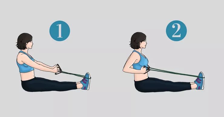 直角坐立在垫子上,弹力带套在脚掌上,双手伸直,吸气,将带子向后拉,呼气,伸直手臂。每一个位置点停留10-20秒,重复10组。