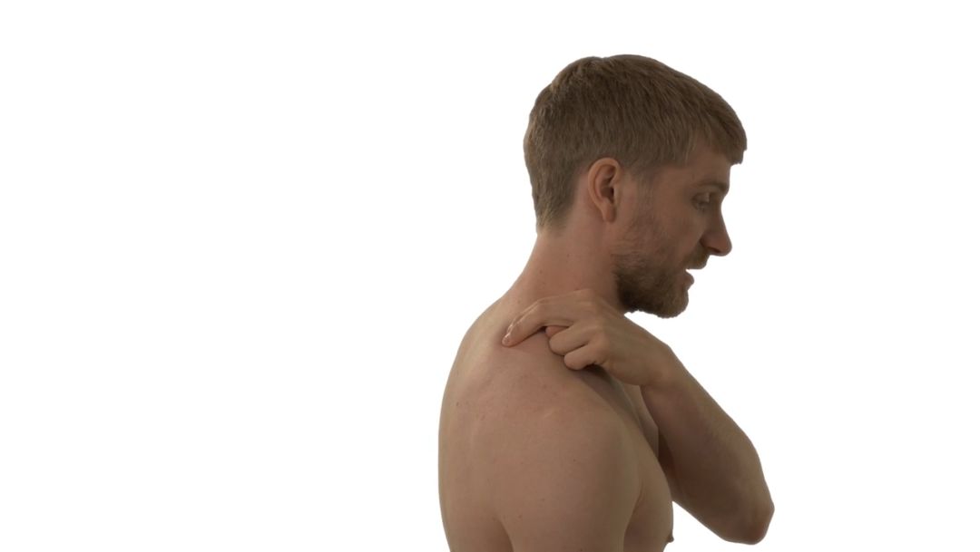 要找到肩胛提肌,你必须经由斜方肌来找感觉,当肩膀抬起和下垂时,你会感觉到肩胛骨的运动,一旦按到肩胛骨的内缘,将手向上挪动到脊柱附近。
