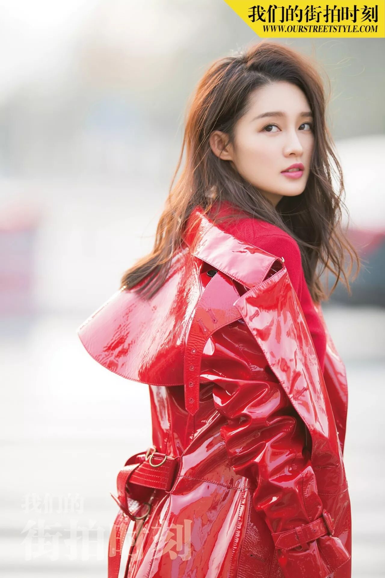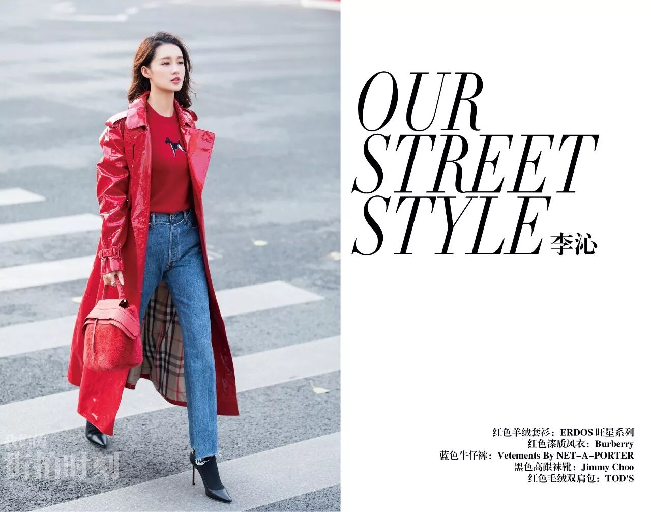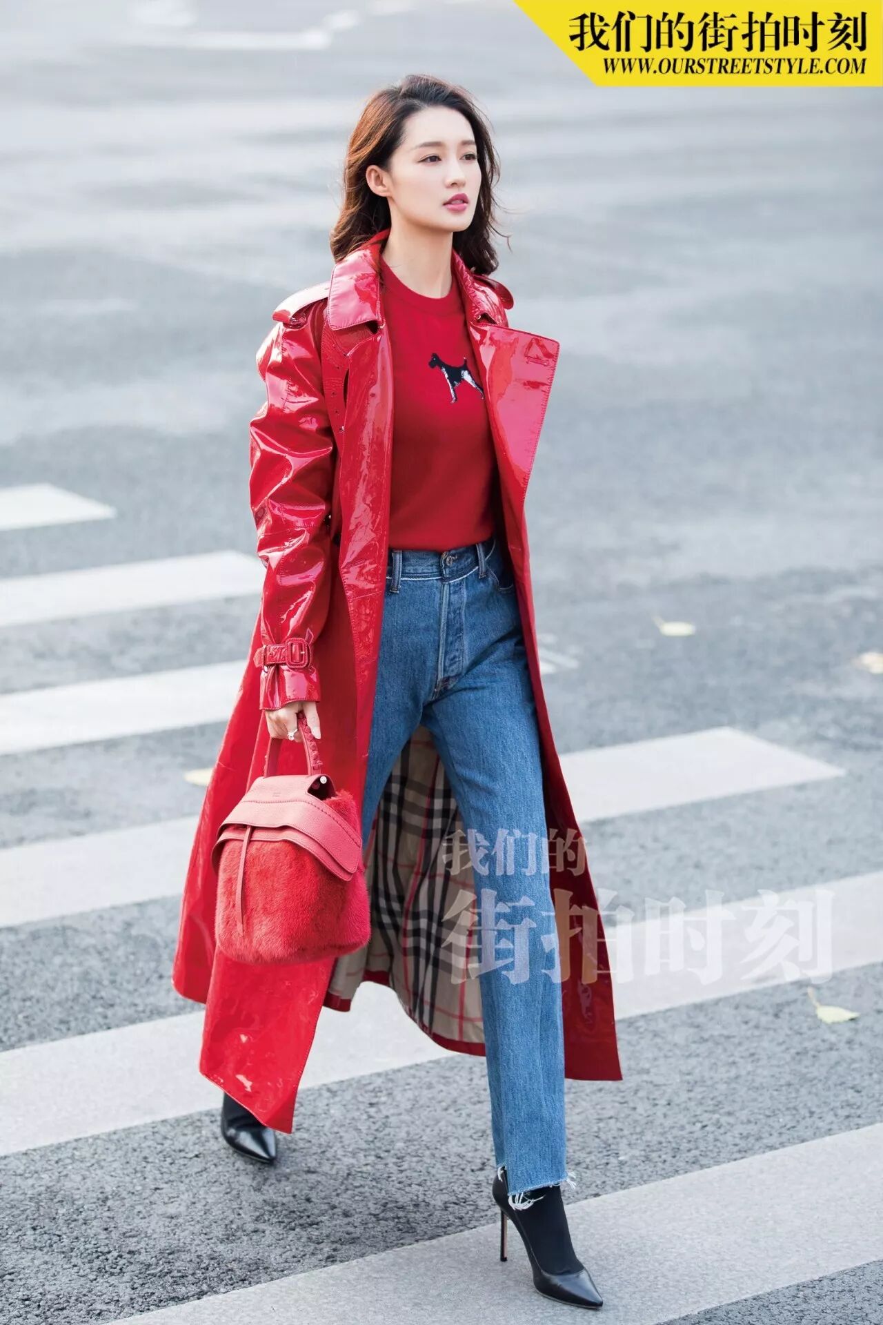 Tips:一款红色长款皮衣外套增强了整个人的气场,不仅色彩感十足更加霸气外露!内搭红色毛衣和红色手提包更是突出了整体以红色为主的主色系。蓝色高腰牛仔裤不仅与红色外套形成强烈的色差感,更是尽显大长腿的优势! 整套造型出现在街头必然十分吸睛耀眼!