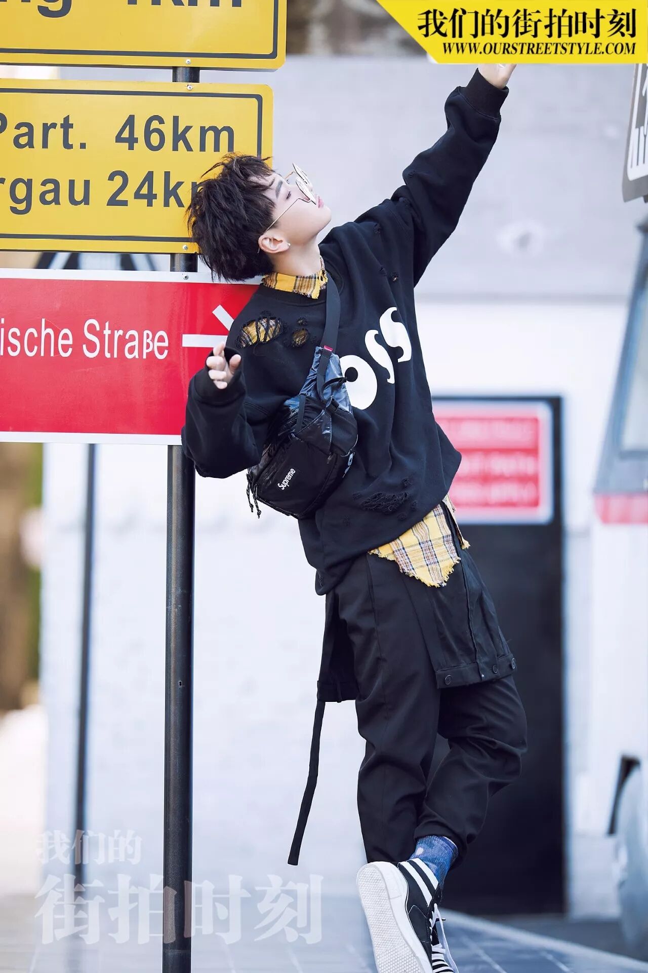 Tips:黄色格纹衬衫搭配黑色廓形破洞卫衣,流行的穿法十分亮眼。下面搭配黑色工装背带裤,微微挽起的裤脚,配上黑色休闲鞋,加上彩色太阳镜的点缀,时尚新潮范儿十足!黑色字母腰包的搭配也是带感!
