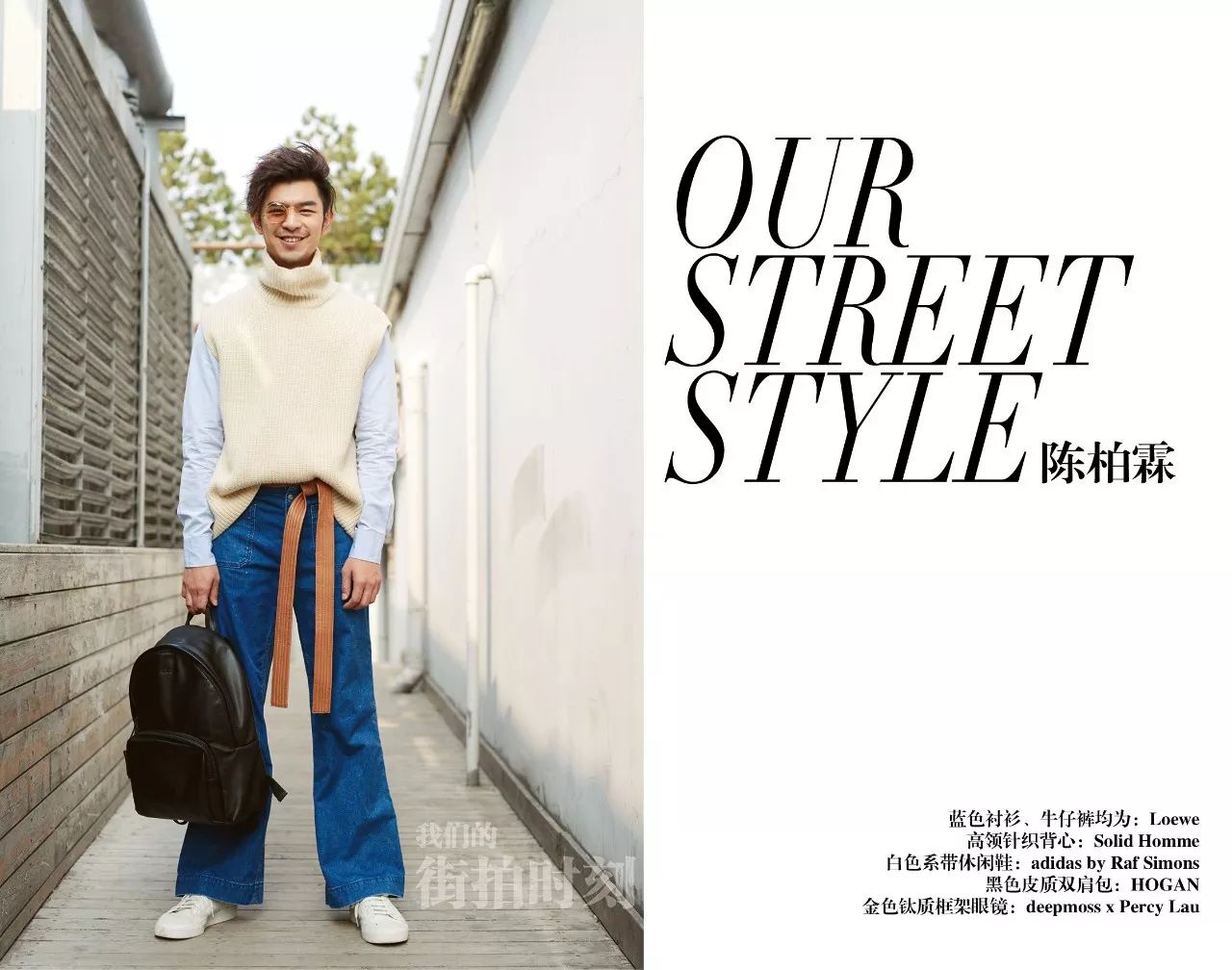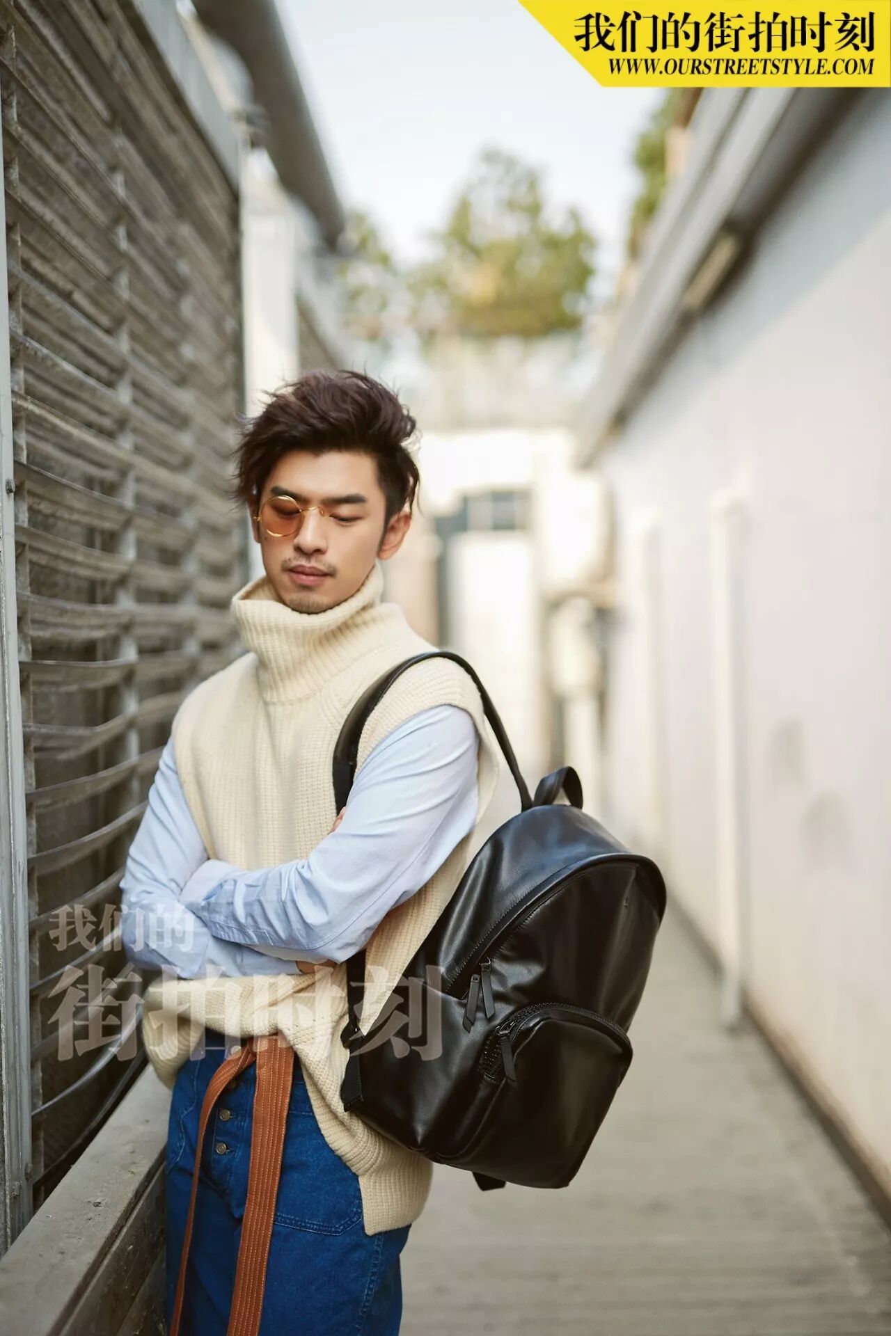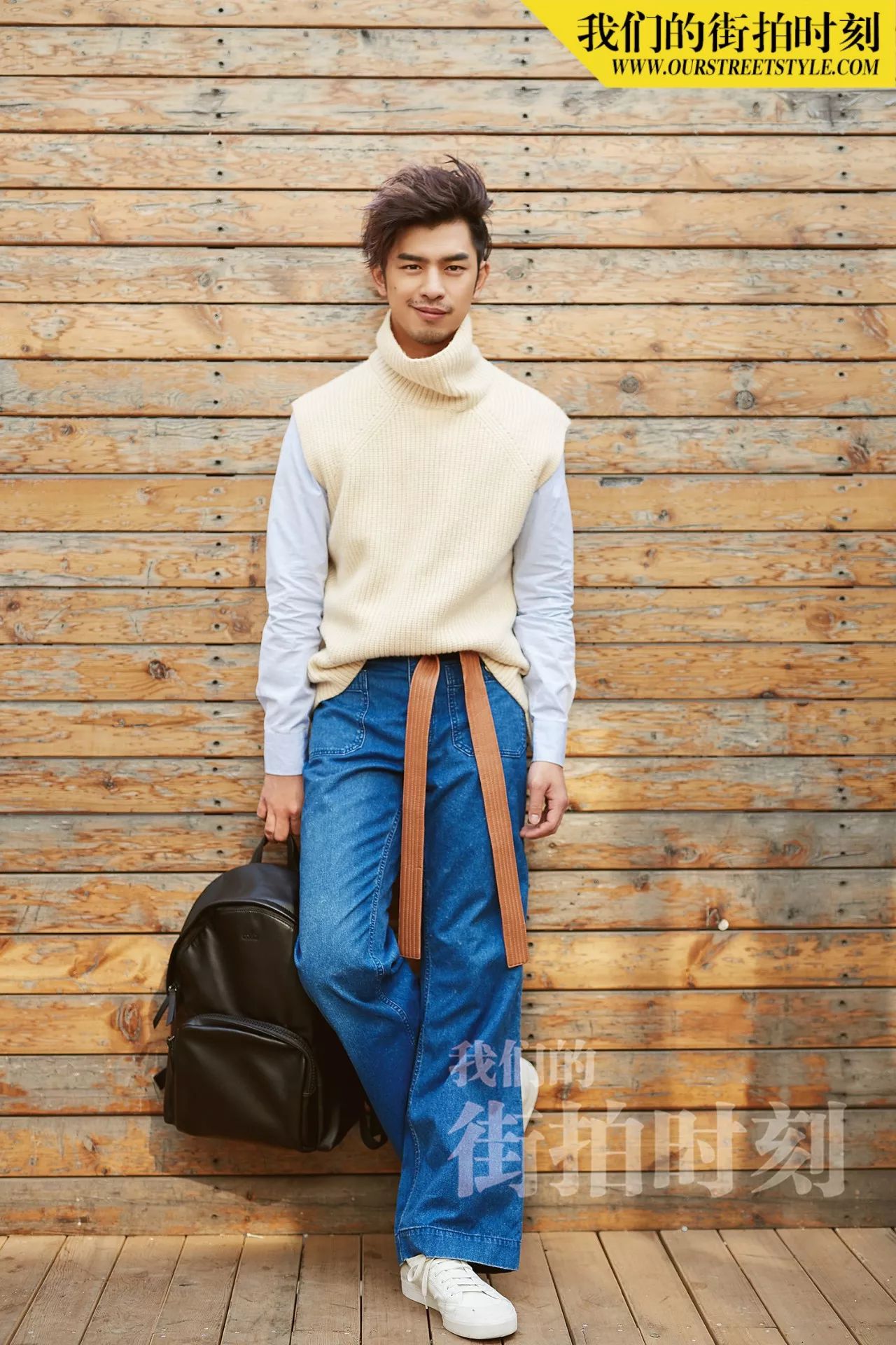 Tips:毛衣+衬衫的组合在平常不过了,但是高领针织背心搭配蓝色衬衫却让人眼前一亮。下搭牛仔阔腿裤和小白鞋,随意帅气!再配上黑色皮质双肩包,整套Look营造出冬日慵懒的意境!
