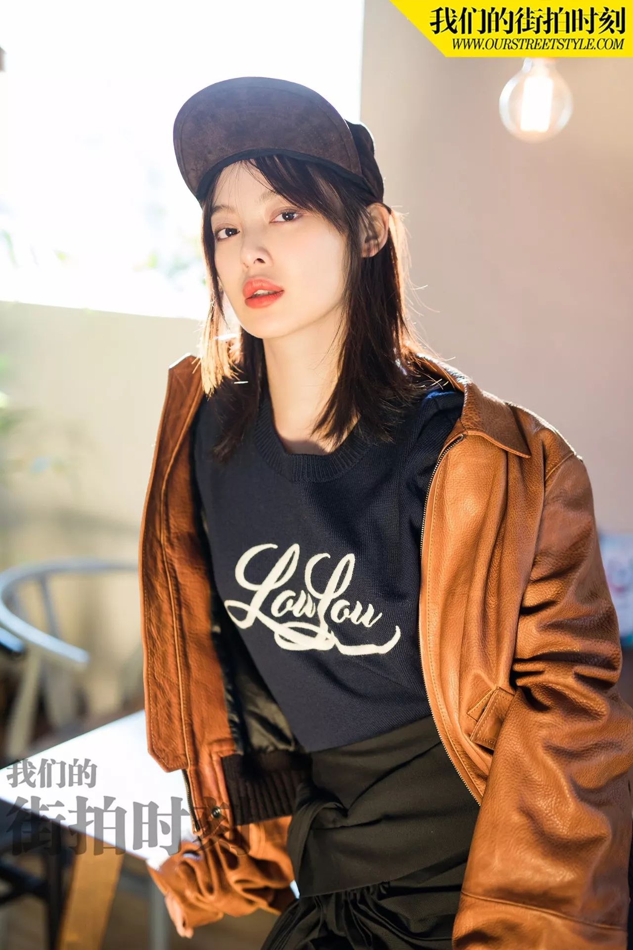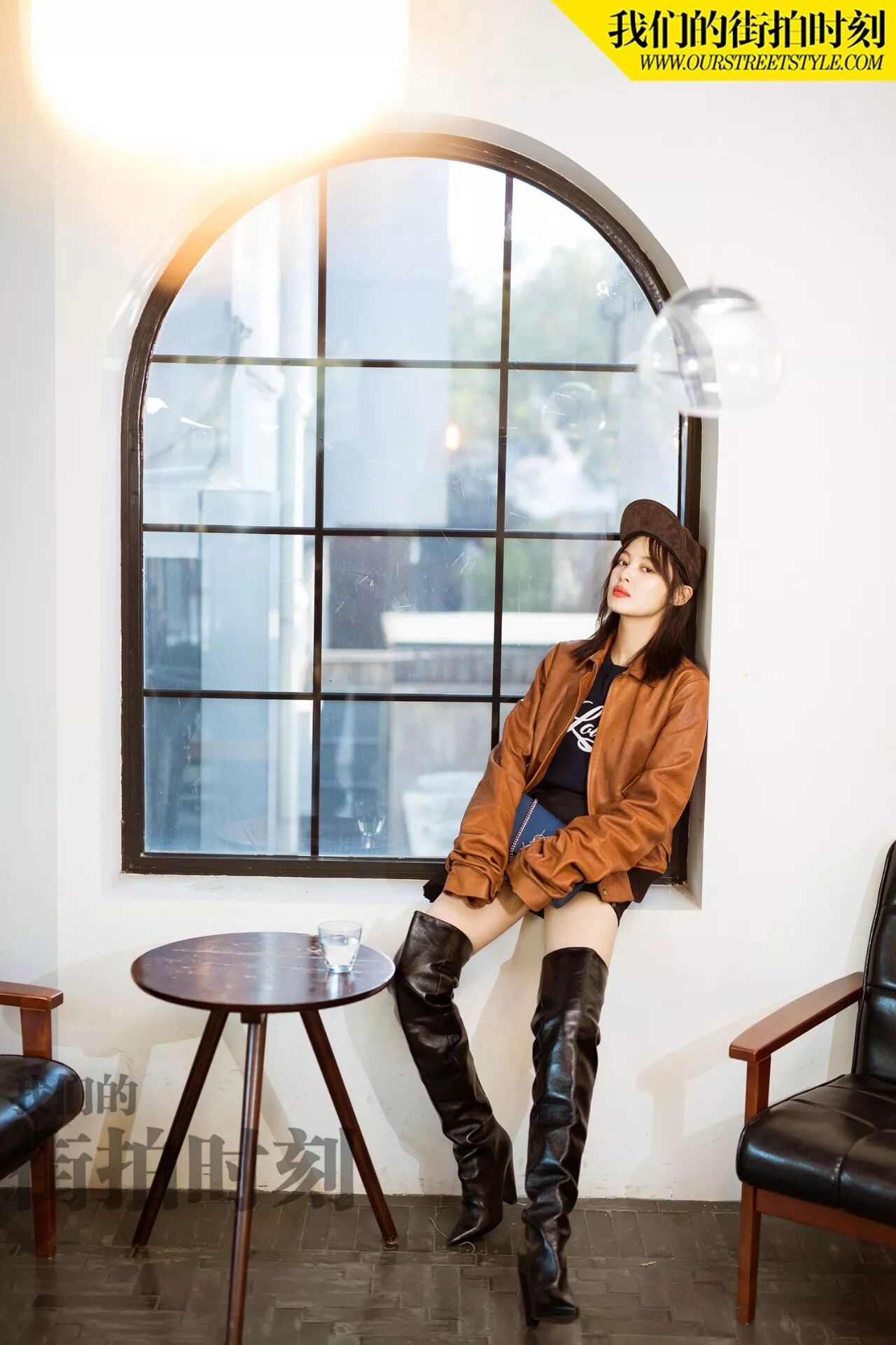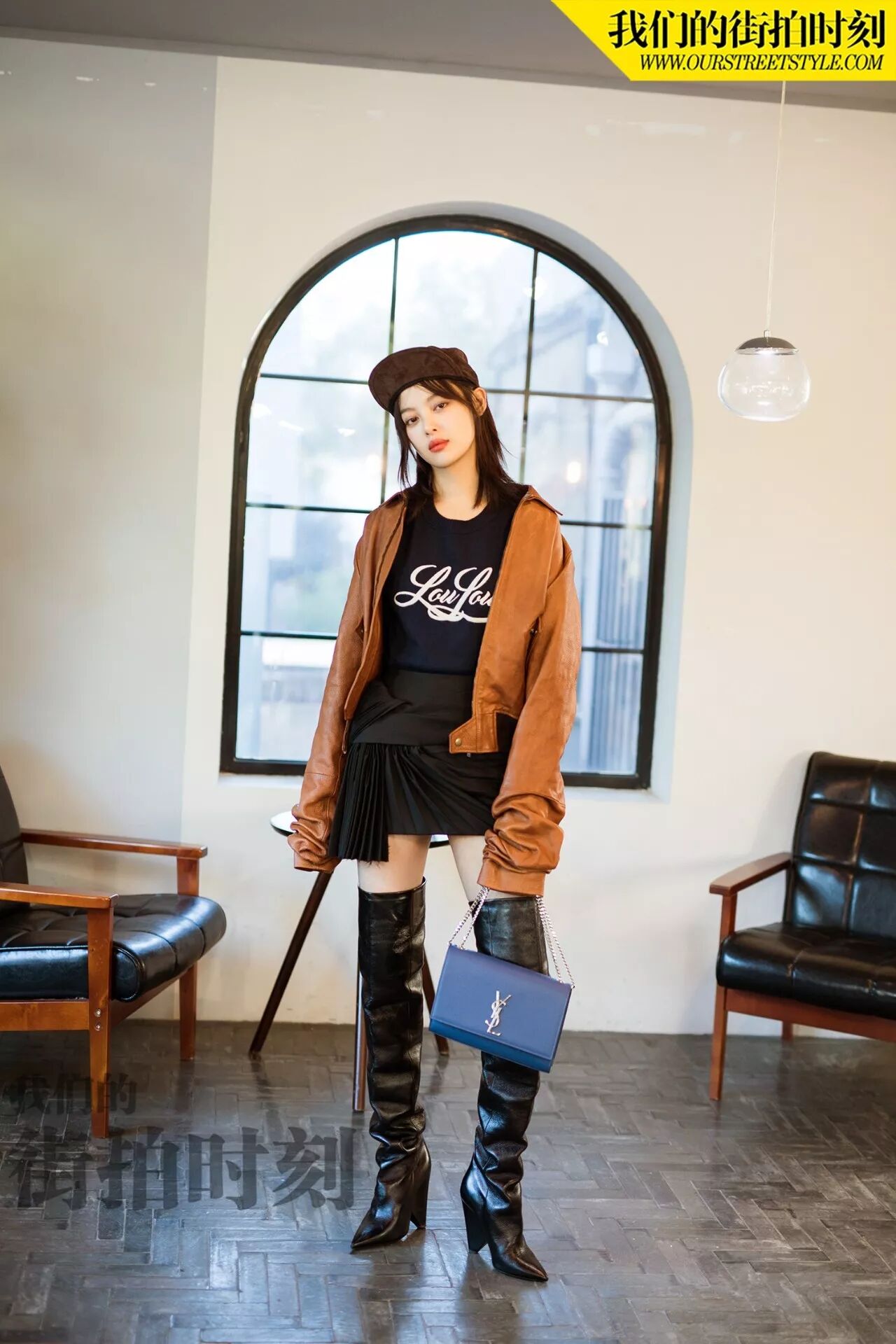 Tips:长筒皮靴和小短裙的组合拉长腿部线条,营造了满屏尽显大长腿的效果,一件皮衣外套不仅酷劲十足,更加看起来十分干练气质!帽子的搭配增添了一丝俏皮可爱的感觉,让整体造型风格柔和了许多。