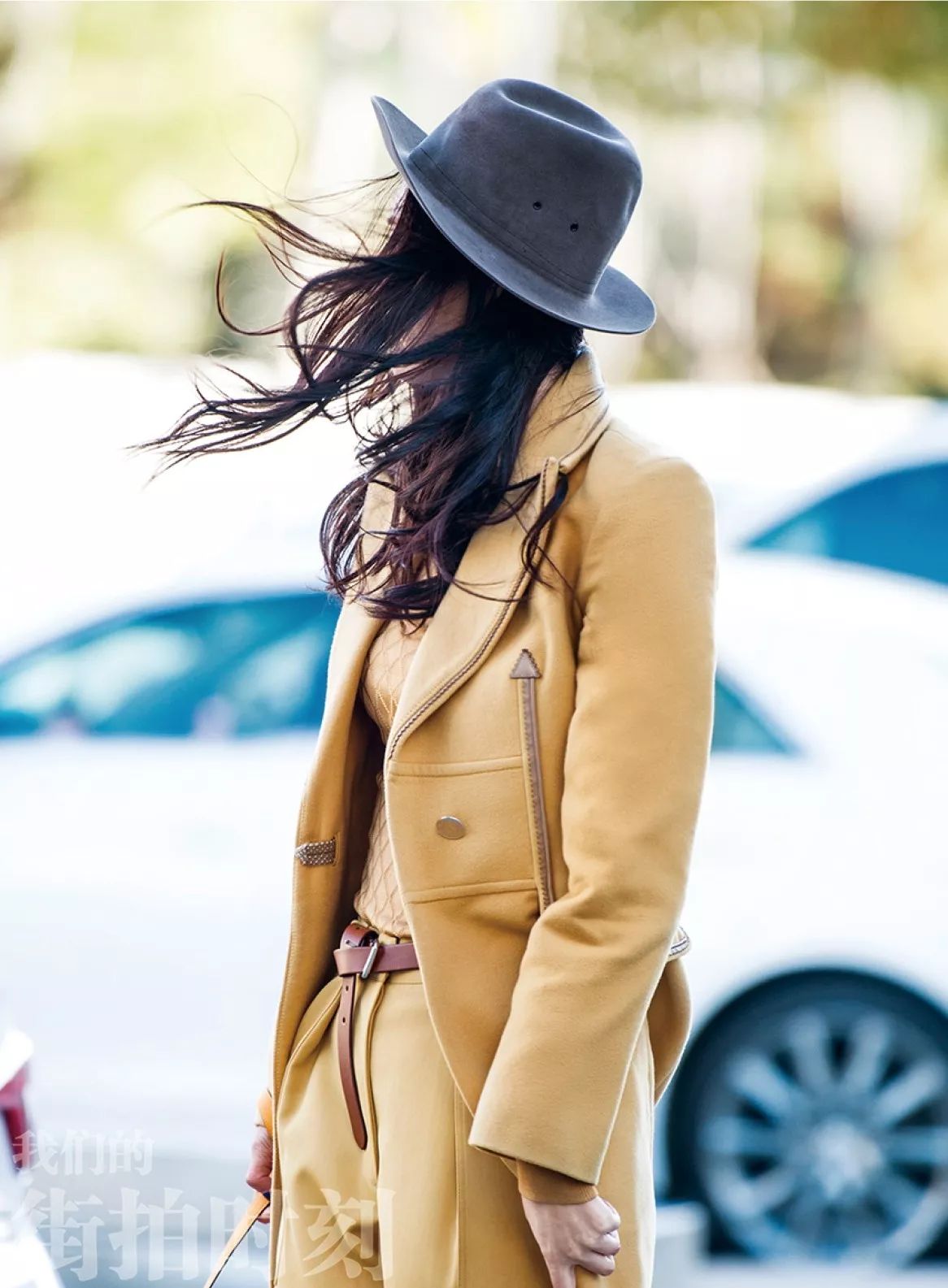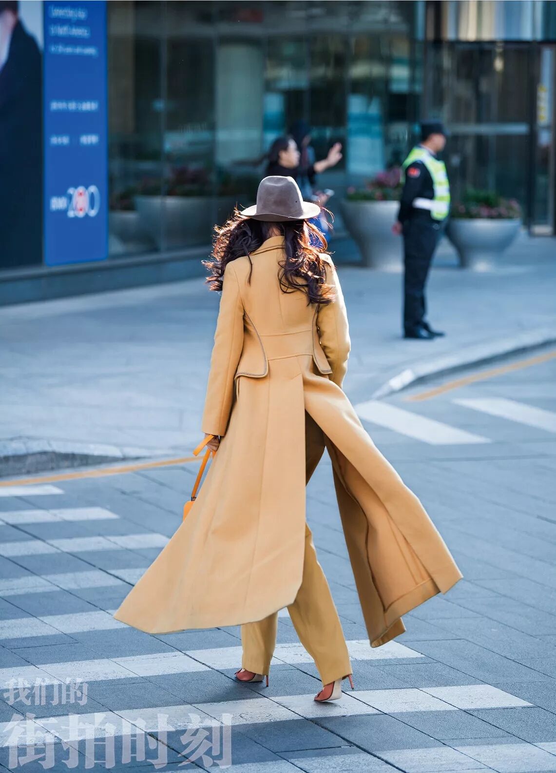 Tips:在寒冬里一身驼色搭配看起来十分温暖舒适,大热的驼色穿搭出现在街头也显得十分高级。长裤与长款毛衣的组合让人看起来十分有气场,一个小礼帽的点缀让整体看起来非常具有英伦气质!