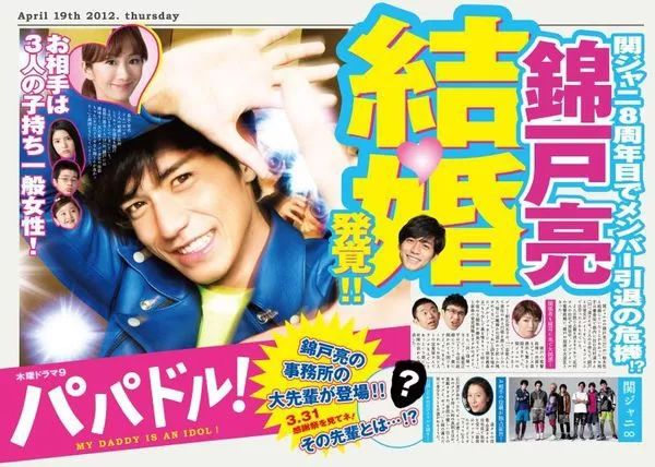 2012年,主演木9日剧《爸爸是偶像》。这部剧中关于杰尼斯事务所的部分全部由真人本名出演。锦户亮在剧中饰演自己,是关8的一名成员。该剧讲述了身为偶像的他与一个比自己年龄大并带有三个孩子的女性相爱并偷偷结婚的故事。“我的名字叫锦户亮,是关8这个组合中的一名成员,说起来真不好意思,我就是所谓的偶像!”锦户亮在月九剧《爸爸是偶像》中出演的角色也叫锦户亮,跟现实中的他一样,是杰尼斯事务所旗下“关8”组合的成员,是全日本的当红偶像。可是剧中的锦户亮放着前途璀璨的明星路不好好走,偏要执意跟一位有3个孩子的单亲母亲闪婚,是一个十足喜闹剧!锦户亮在剧中的对白说:“我12岁踏入这行,唱歌跳舞演戏,我只会这些。”听起来更像是他本人的真实想法,因为他本人正是12岁进入娱乐圈,从童星做起打滚15年。这些真名、真工作、真心话加在一起,让粉丝看得很有真实感,从而满足对偶像生活的好奇心,这也是该剧的目的所在。首次尝试自己演自己的锦户亮,就希望通过这部剧看到,“外界眼中的锦户和我自己心目中的锦户的落差。”
