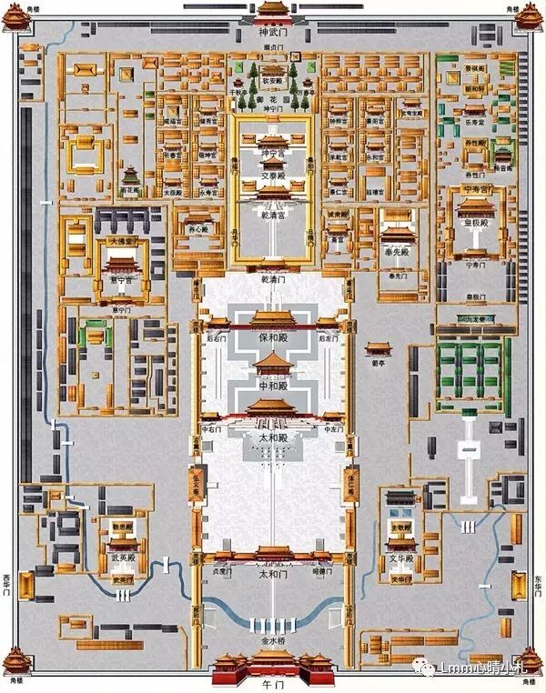 中轴即午门——金水桥——太和门——太和殿——中和殿——保和殿——乾清门——乾清宫——交泰殿——坤宁宫——坤宁门——御花园——崇祯门——神武门。
