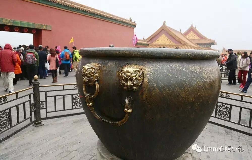 在故宫的各个地方都放置了大小水缸308口,主要是用来储水防火,其中太和殿前有4口。八国联军侵华时,侵略者窜入紫禁城,因水缸太沉搬不走竟然用刺刀刮去缸上的金子。如今依见刀痕累累,铭记历史,勿忘国耻!