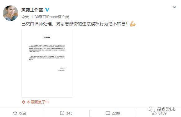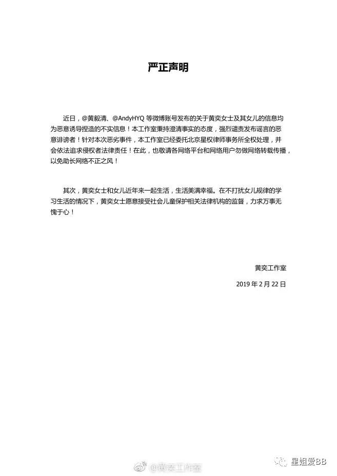 昨天,黄奕工作室发布声明,称黄毅清近日所发布的皆为不实信息,此事已交由律师处理,对恶意诽谤的违法侵权行为绝不姑息。