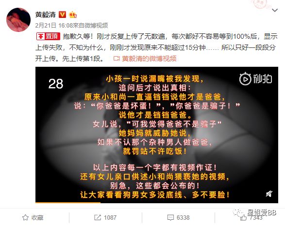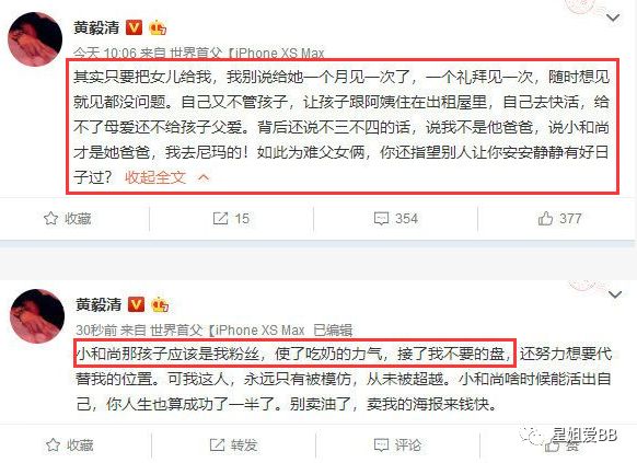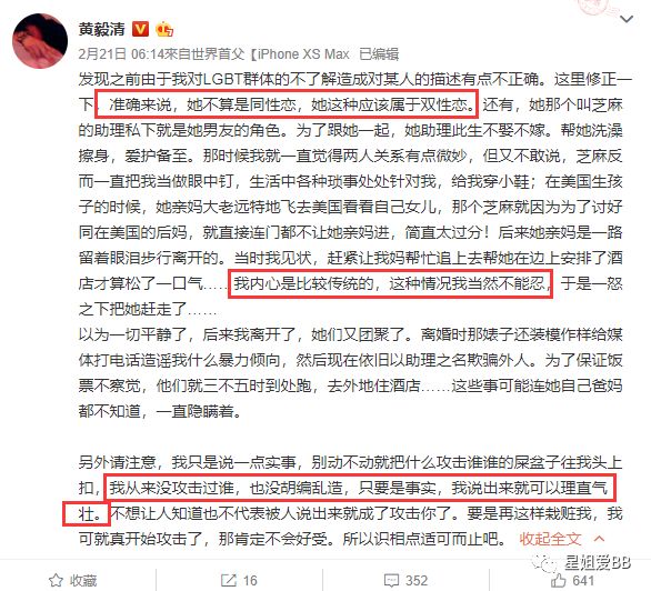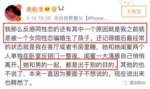 随后他又更了一条,这条直接明示黄奕就是同性恋,并且他还被黄奕“骗婚生了孩子”。