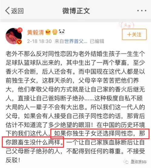 日前,黄毅清在微博上谈起了同性恋的问题,发表了一些言论,比如“独生子女还选择同性恋,那你跟畜生没什么两样”。