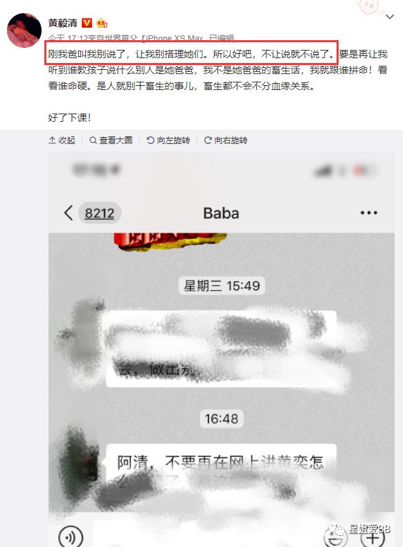 后来黄毅清还晒出了爸爸劝说他的截图,放狠话说会不顾一切保护好女儿之后,他表示可以“下课”了。