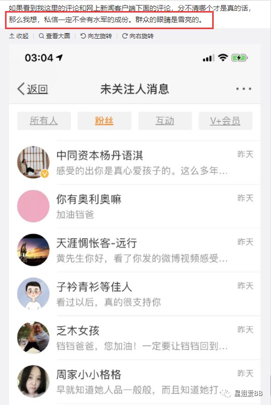 不过黄毅清这边心态很好,他表示很多支持黄奕的声音都是黄奕请的水军,不少“看通透了”的网友私信支持他,他相信“群众的眼睛是雪亮的”。
