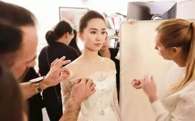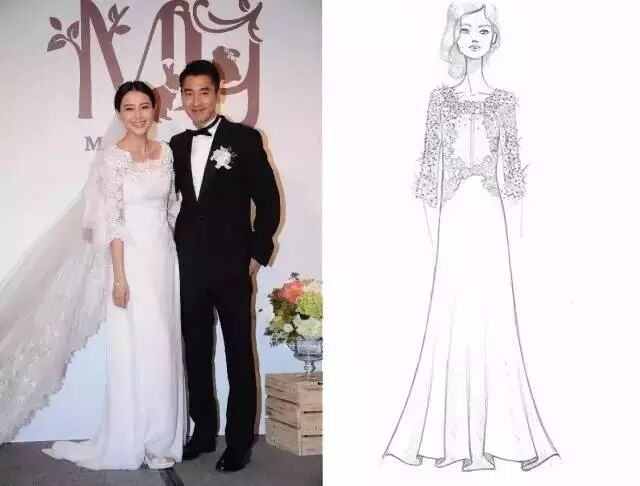 高圆圆的婚纱来自和她合作最密切的Chloé,圆圆女神不喜欢蓬蓬裙,选择了优雅简洁的设计。这也是Chloé首次做定制婚纱,预估三四十万一件