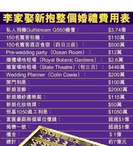 徐子淇嫁给李家成,都十年前的事儿了,但开销现在看起来依然触目惊心,算起来花了七亿港币。