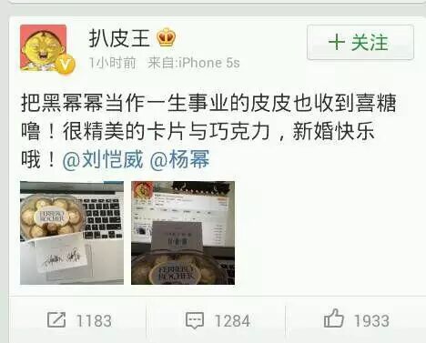 大幂幂广为流传的喜糖梗:把巧克力按规格分成三六九等,最大盒送给了范冰冰、孙俪等大咖