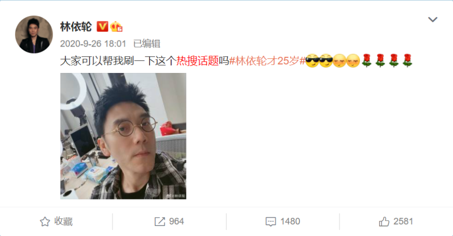 在2020年9月的时候,林依轮因为话题#林依轮#状态上热搜,他还调侃自己只有25岁。