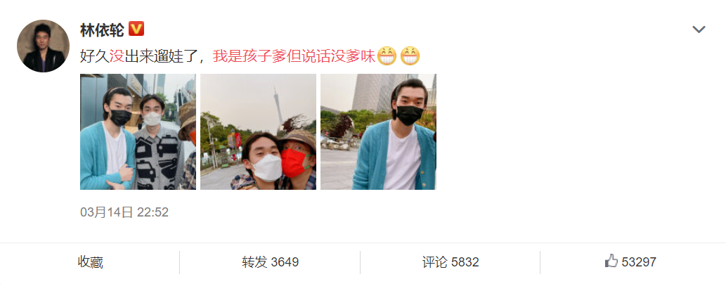 今天,林依轮在微博上晒出了一张与两个儿子在广州出门遛弯的合照,并配文“我是孩子爹但说话没爹味。”迅速抢占了热搜榜的C位,聚集了700多万的热搜人气,这个“我是孩子爹”就很有灵性了。