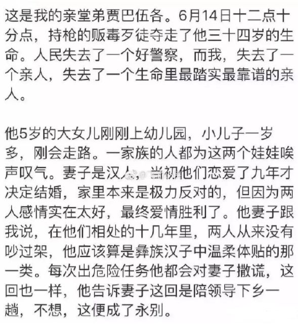 之前歌手吉杰的堂弟,就是牺牲在缉毒工作第一线。每次出任务的时候,只能对妻子撒谎是在陪领导下乡。