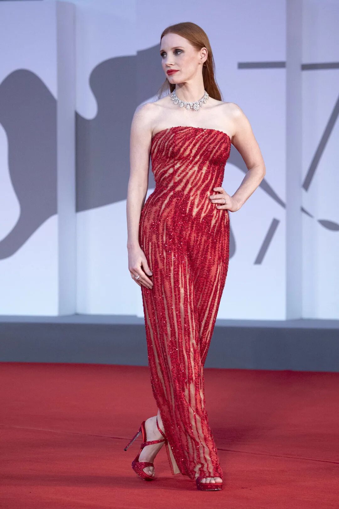 杰西卡·查斯坦穿着一袭红色抹胸透视长裙,她面容成熟妩媚,红色长发飘逸,大秀傲人的事业线,绝对性感迷人。
