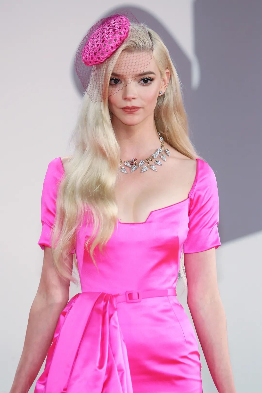 安雅·泰勒-乔伊穿着一袭粉色深V长裙,头戴粉帽和纱巾,她容颜绝美,大秀自己傲人的事业线,还是很性感靓丽的。