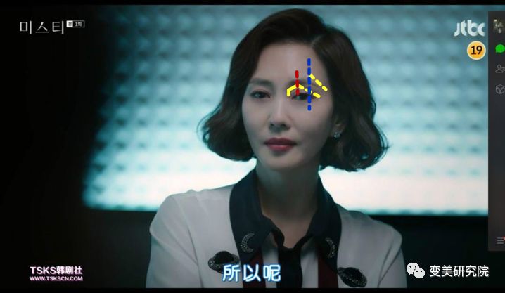 再有一点就是刚才提到的韩国盛行的水光肌底妆,即使在正剧中也会使用轻薄水润的底妆,这就造成在太阳穴—额头大角度折叠后处于不同的光线位置时,颞线后侧的眉妆会跟着底妆一起“反光”从而吃掉眉尾的颜色,这时候就会形成看起来断在眉峰后的眉尾消失了的视觉效果。所以她的眉峰绝无可能再靠后。