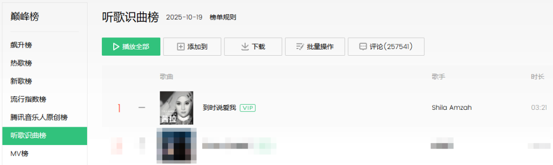 近期,马来西亚女歌手茜拉演唱的歌曲《到时说爱我》火爆全网。在10月19日更新的QQ音乐“听歌识曲榜”中,这首作品排名首位,而在10月20日更新的“巅峰榜-流行指数榜”中,这首作品也拿下第二名。