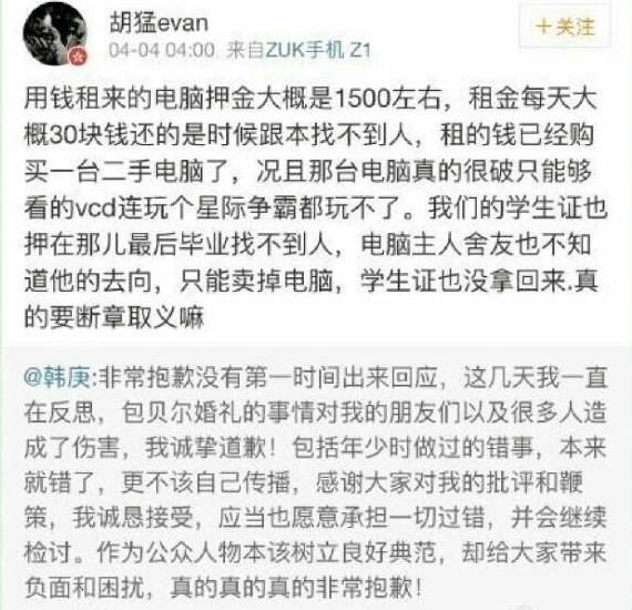 韩庚却说,当时和计算机系的同学合伙租电脑,最后背着这个同学,把电脑卖了,还说这个同学可能到现在才知道。