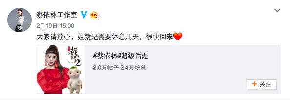 虽然工作室和本人都轻描淡写的讲述病情,让大家放心,但是能让向来“轻伤不下火线”的蔡依林都推掉工作专心住院的病,一定是蛮严重的!
