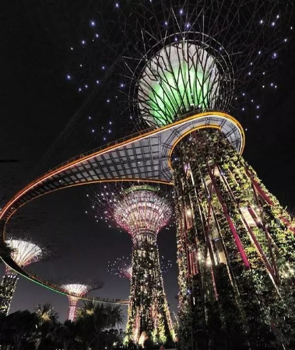 Supertree!其实是塔状垂直结构的树形花园,高25-50米,可吸收雨水,生成太阳能!白天可以帮助调节温度,晚上坐在Supertree树下,能欣赏阿凡达般的树林灯光秀。