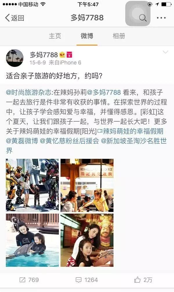 去新加坡亲子游的明星比较多,李小鹏和女儿奥莉、孙莉和女儿多多、郭涛和儿子石头都曾受新加坡旅游局邀请去体验畅游,孙莉曾在微博上表示:这是一个适合亲子旅游的地方。