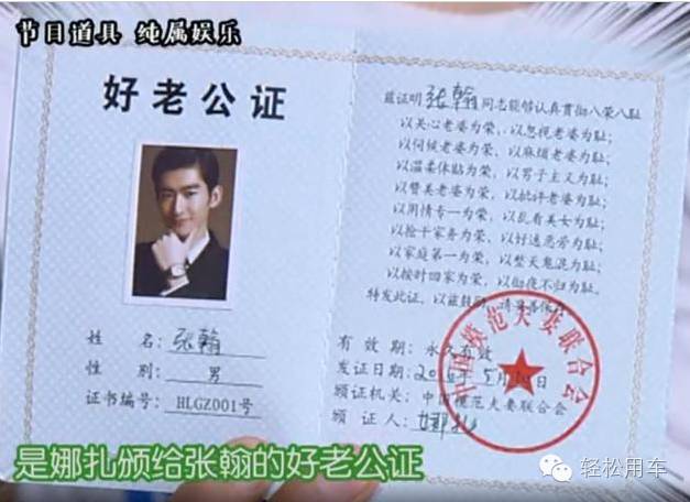 不过节目组也为这个证件打上说明:节目道具,纯属娱乐。一旁的娜扎看到这个证件,本来一直严肃认真,立马露出了灿然的笑容,还略有害羞的转过脸。可真是“虐狗”指数爆棚。包贝尔更在节目里开玩笑说:“我赌上这一对的婚姻幸福!(证明我说的是真话)”