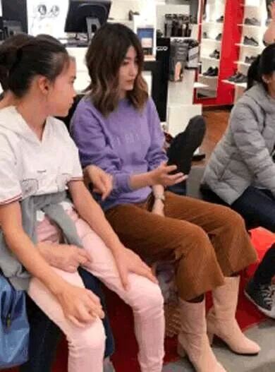 可能这张照片抓拍的不是特别的好,所以看起来自然而然就比较模糊,这次她把头发弄到了一边,就显得脸会更大一点,不过她身上穿的这条裙子选择的又是黑色,前面的裙摆比较短,后面长一点,这样就显得整个人的腿更长一点!