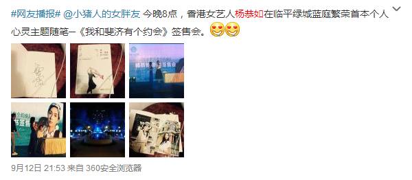 昨晚,天粉@小猪人的女胖友 私信@天天看余杭 说,香港女艺人杨恭如在临平某房产举行首本个人心灵主题随笔《我和斐济有个约会》的签售会。