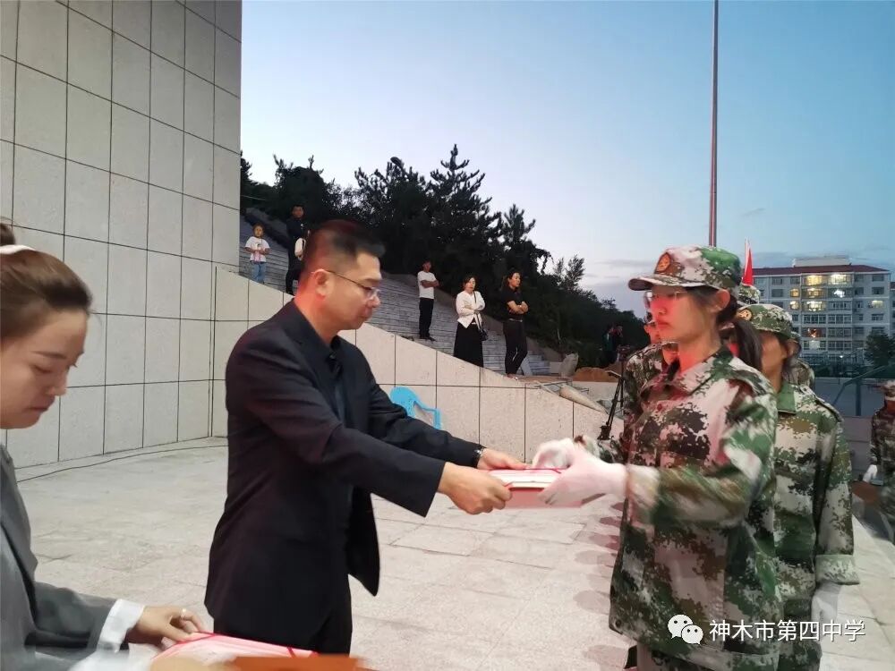 9月2日下午6:00,全体参训师生、教官在四中操场举行了隆重的军训汇报表演。出席大会的有神木市委常委、神木市人民武装部部长马智磊,神木市人民武装部副部长詹正平、军训团团长高梓淳、副团长张鹏飞、第四中学校长呼天毅、副校长白涛、副校长刘树利、副校长任银海、副校长王小明、工会主席王秀山、校长助理马利平、德育处主任李锋志。大会由德育副主任李军主持。