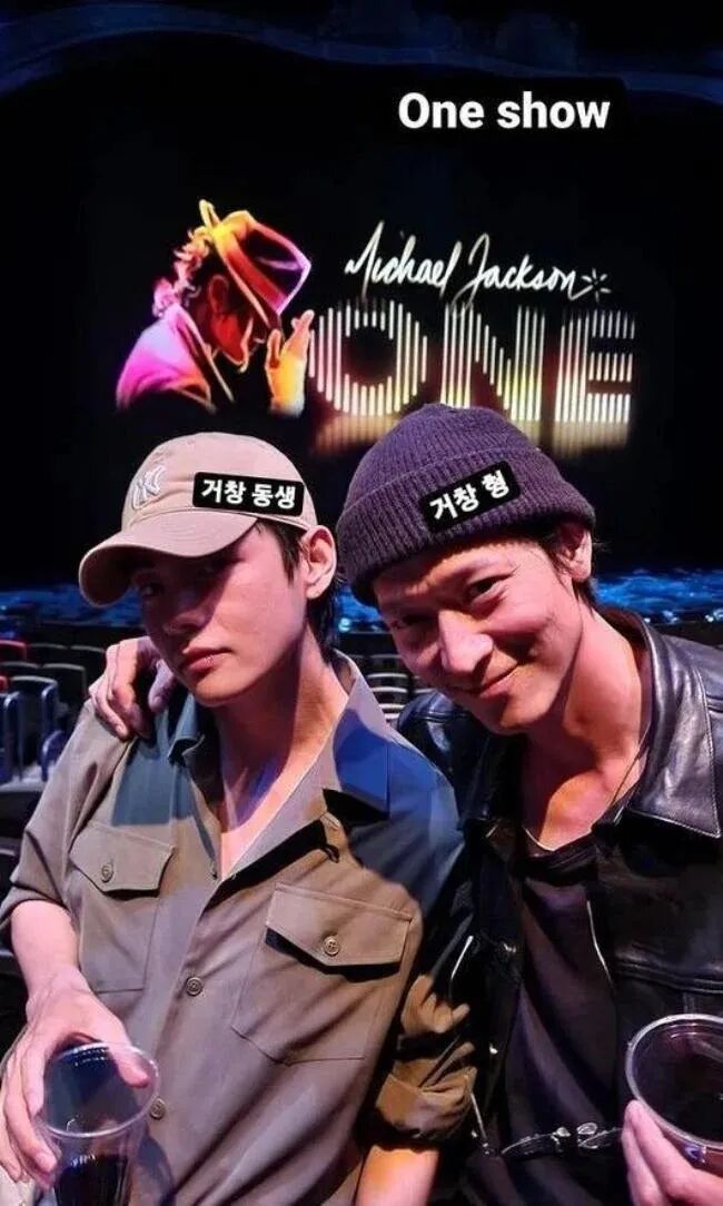 13日,V通过个人IG Story公开了一张自己和姜栋元的合影,还配文「居昌弟弟,居昌哥哥」。照片里两人都戴著帽子,姜栋元亲昵地搂著V的肩膀,哥哥面带笑容,反而是弟弟故意摆出酷酷的表情,两人自然没有过多装扮的样子依旧帅气度爆表,果然明星的素颜也很不一样啊。两人的身后是「Michael Jackson ONE」的字样,看来他们是一起去看了演出啊。为什么是「居昌兄弟」呢?原来V是居昌郡出身,而姜栋元则曾在居昌郡上过学,因为这个地方两人结下了缘分。