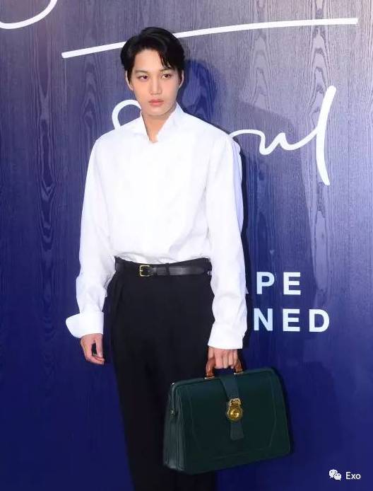 上图为KAI出席位于首尔江南区清潭洞Burberry 2017 S/S Launching Event,在Photo time中留下的帅气纪念照。简洁分明的黑白搭配,白色衬衫搭配高腰西裤,突出了钟仁宽肩细腰大长腿的身材优势,完美模特比例让全场自动聚焦,手提墨绿色皮包复古又大气!