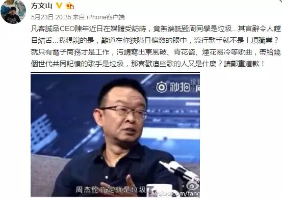 当他因为说周杰伦一百年之后是垃圾而被淹没在一片骂声中时,有人站出来为他辩解。结果,这位叔叔完全不知错,在周杰伦的好友方文山发微博要求其道歉时,他其实可以坐视不理的,但万万没想到,他还隔空回应了,看完回应,说一句陈年无辜,我打字的手指头都不信。要说炒作,还能说的过去,毕竟凡客的过往又被扒了一遍呢,还三番五次上头条,娱乐版的、创投版的,这是要承包啊。