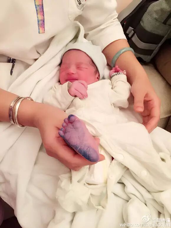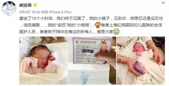 4月4日晚,戴娇倩在微博晒出一组刚出生女儿的近照,并激动地写道:“昏迷了10个小时后,我们终于见面了,我的小猴子,见到你,我想忍还是没忍住,泪流满面。我的“安欣”我的“小格格,谢谢医院的全体医护人员,谢谢昨天陪伴在身边的所有人,感恩大家。”